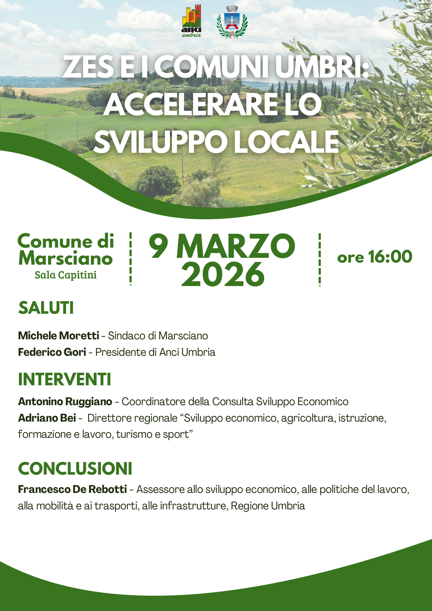 L’incontro, promosso da Anci Umbria, è in programma lunedì 9 marzo 2026 alle ore 16.00 presso la sala Aldo Capitini in Municipio. Vedrà la partecipazione di rappresentanti istituzionali e amministratori regionali e locali, impegnati nel confronto sulle prospettive di sviluppo economico e sulle ricadute positive per imprese, lavoro e comunità.